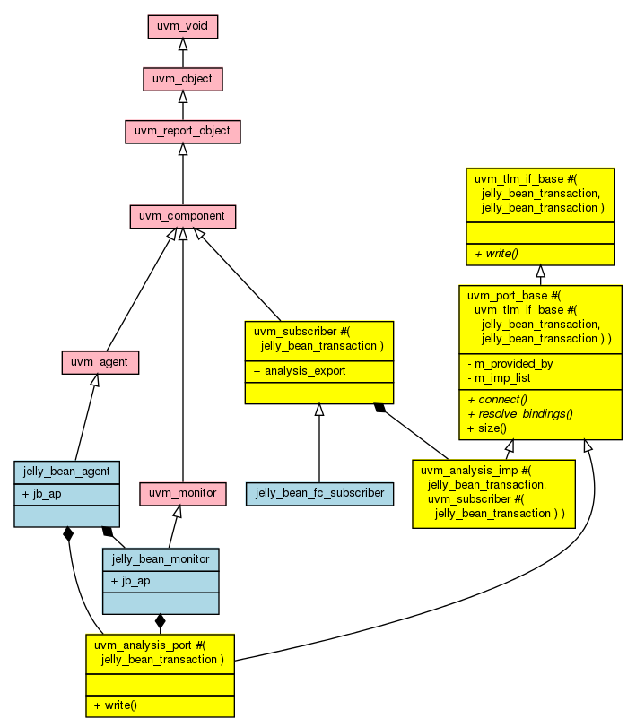 We will look at how the above code works in detail in this post. The class diagram related to the analysis port is shown below. UVM standard library classes are shown in pink, while the UVM classes specialized with the jelly_bean_transaction type are shown in yellow.